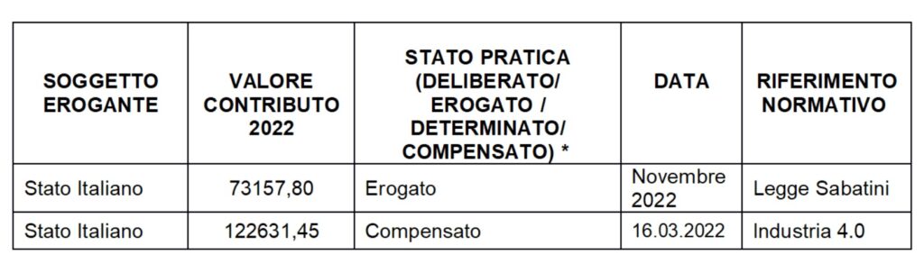 In ottemperanza agli adempimenti di trasparenza e pubblicità previsti ai sensi della Legge n. 124 del 4 agosto 2017 articolo 1 commi 125-129 (come sostituito dall’art. 35 del D.L. n. 34 del 30 aprile 2019) che ha imposto, a carico dei soggetti non tenuti alla nota integrativa, l’obbligo di indicare nei propri siti internet o analoghi portali digitali, entro il 30 giugno di ogni anno, “gli importi e le informazioni relativi a sovvenzioni, sussidi, vantaggi, contributi o aiuti, in denaro o in natura, non aventi carattere generale e privi di natura corrispettiva, retributiva o risarcitoria, agli stessi effettivamente erogati dalle pubbliche amministrazioni”, si riportano di seguito gli estremi dei relativi importi: